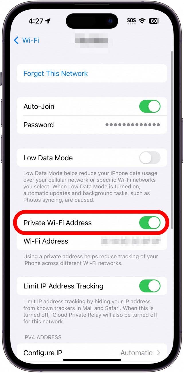 - 点击旁边的开关私人 Wi-Fi 地址启用或禁用此功能。