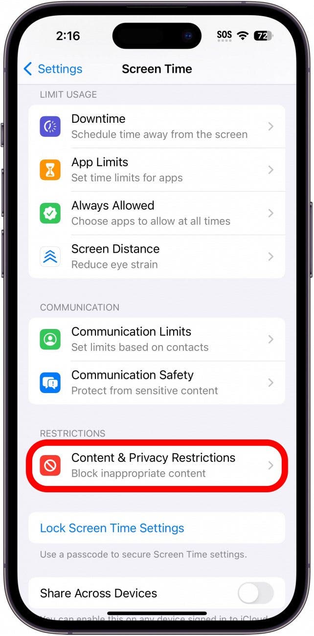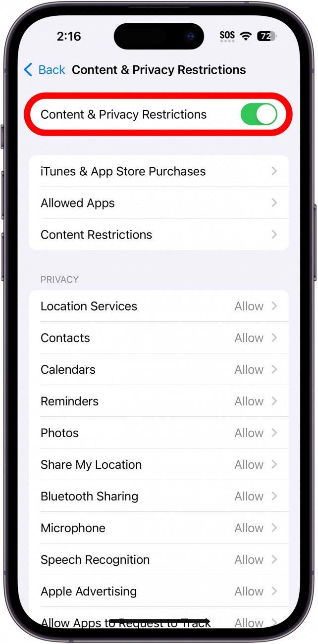 - 启用内容和隐私限制切换,如果还没有的话。启用后,切换开关将为绿色且位于右侧。