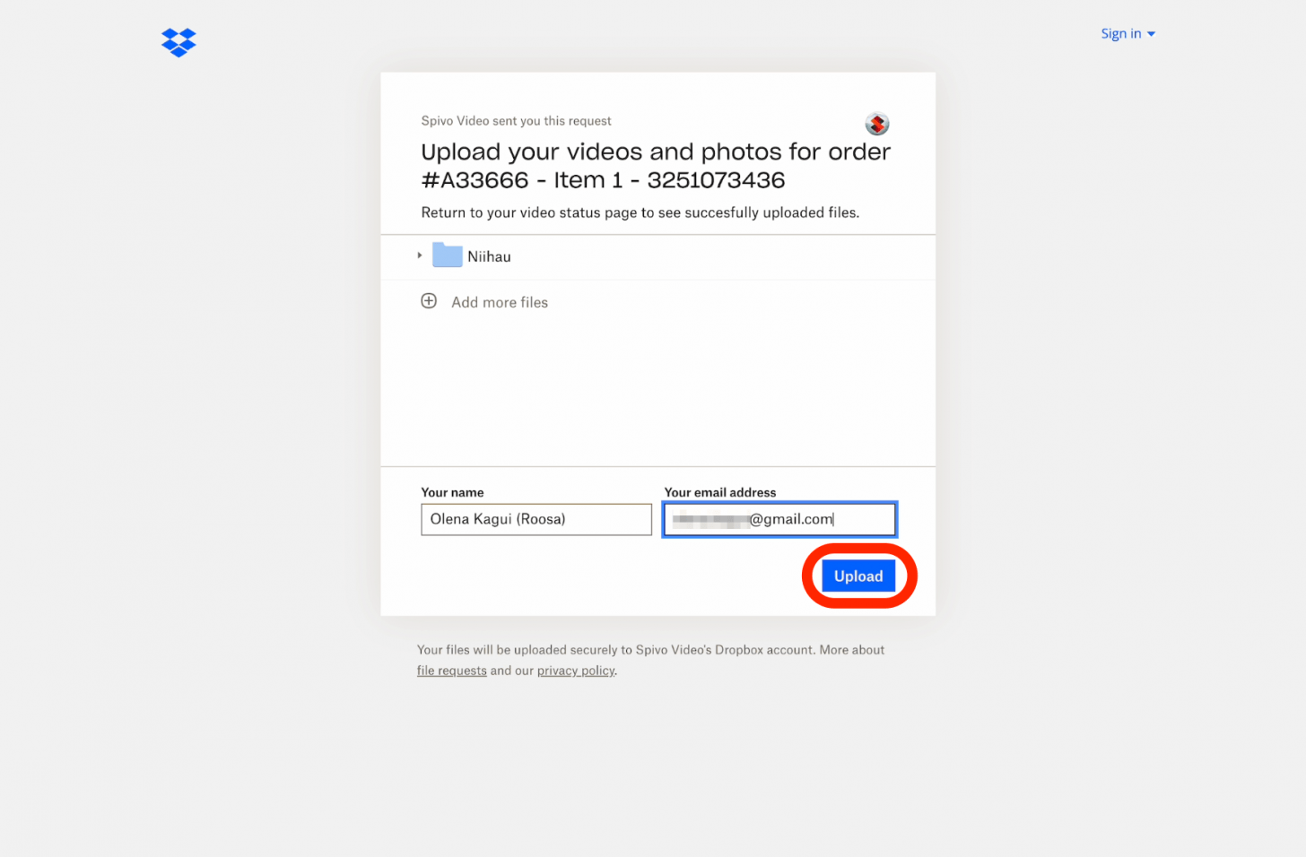 - 返回步骤 15 中的电子邮件并单击您的视频编辑项目再次。在这里您可以查看已上传的文件或上传更多文件。文件全部上传后,下一步是单击提交定制表格。