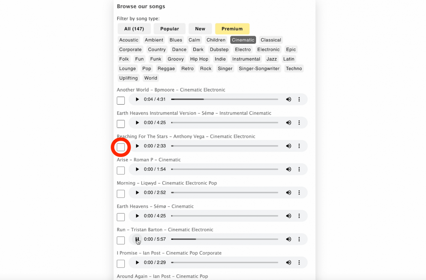 - 要选择一首或多首歌曲,请单击播放按钮左侧的方块。您可以通过单击流派进行浏览,并通过单击播放按钮来收听歌曲。