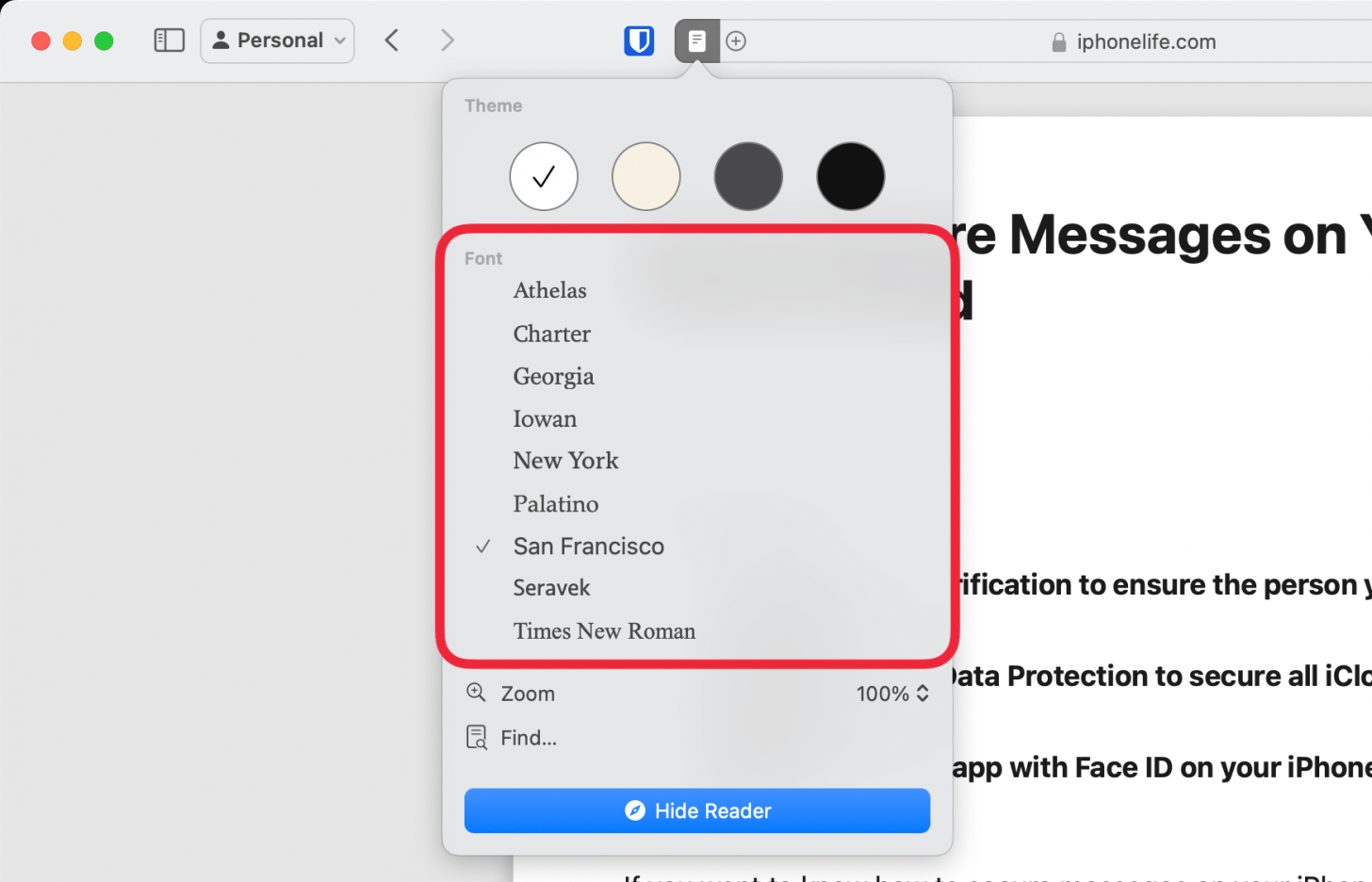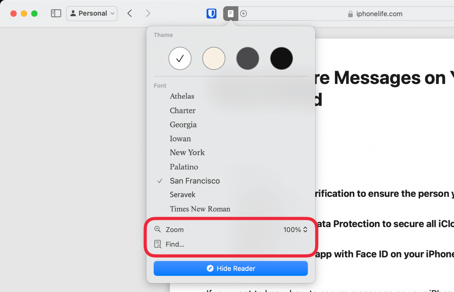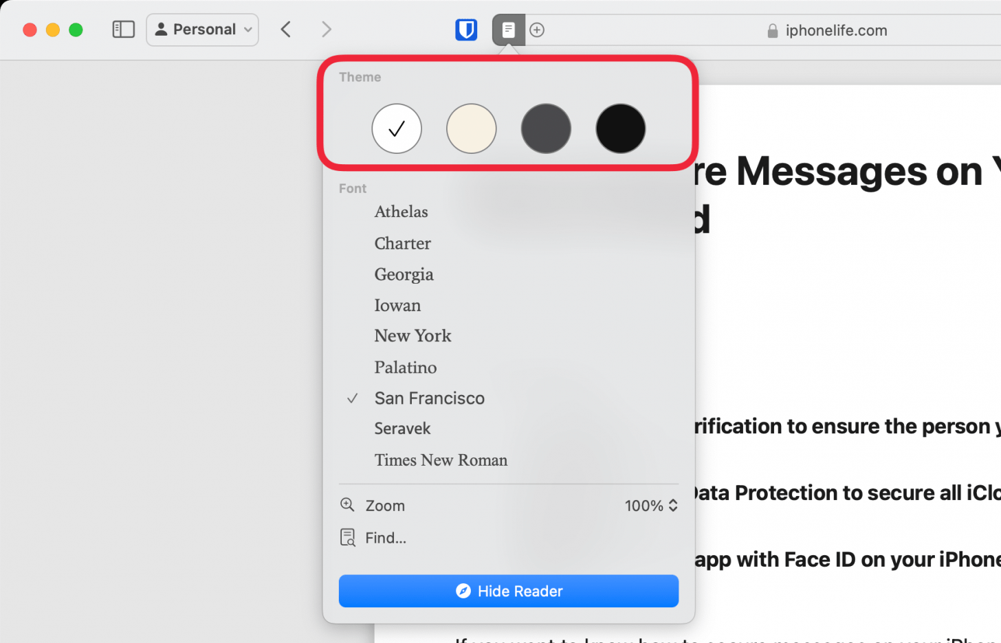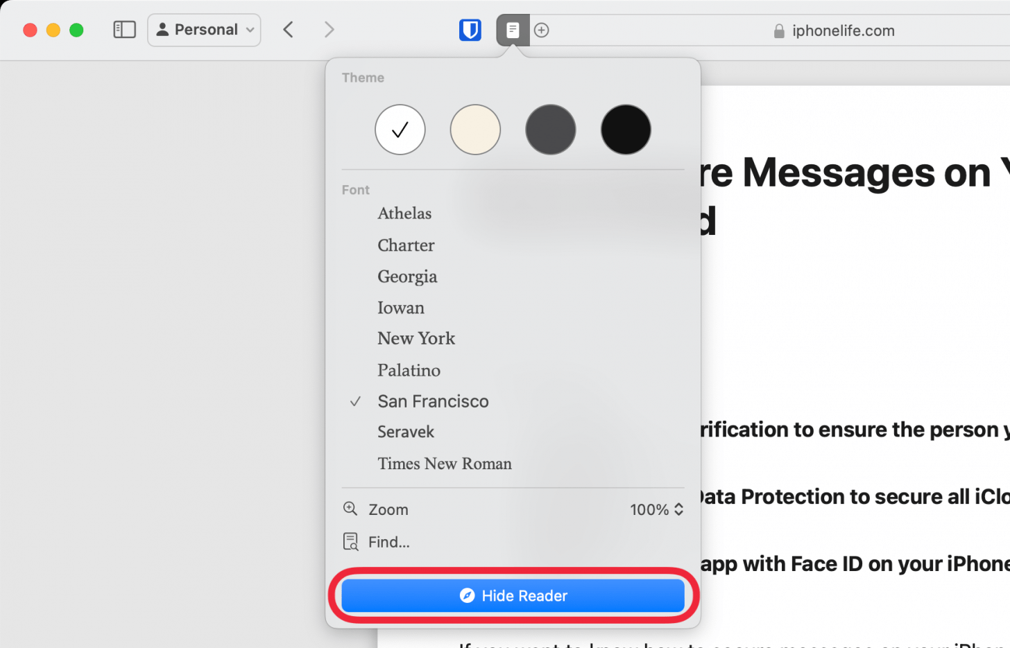 - 要在 Mac 上的 Safari 中关闭阅读器视图,只需单击隐藏阅读器。