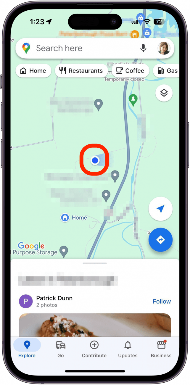 - 在你的谷歌地图应用程序,点击你的位置在屏幕上。