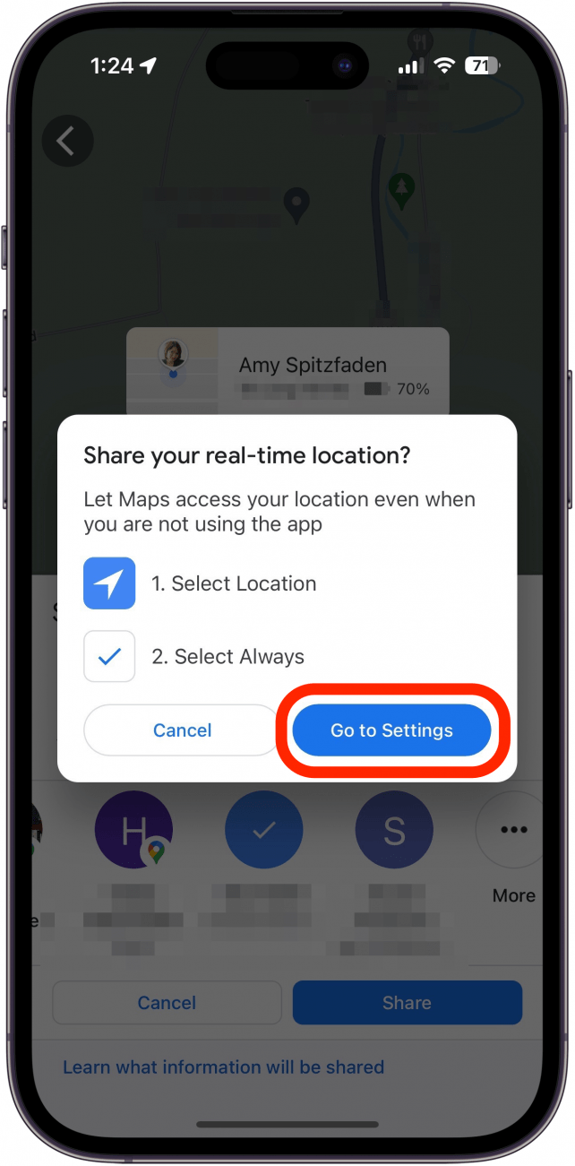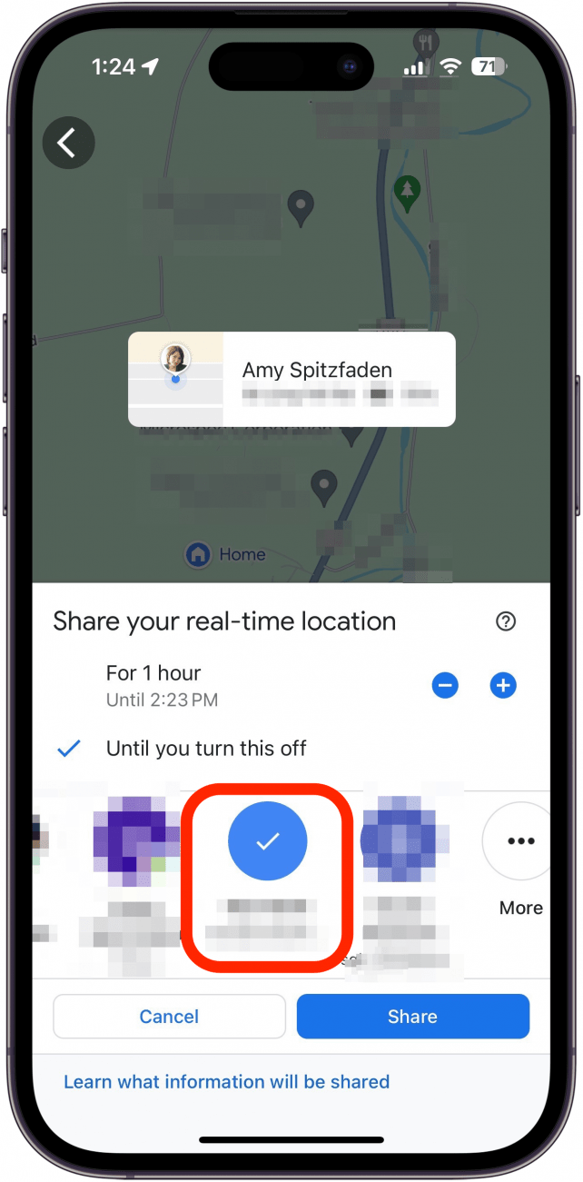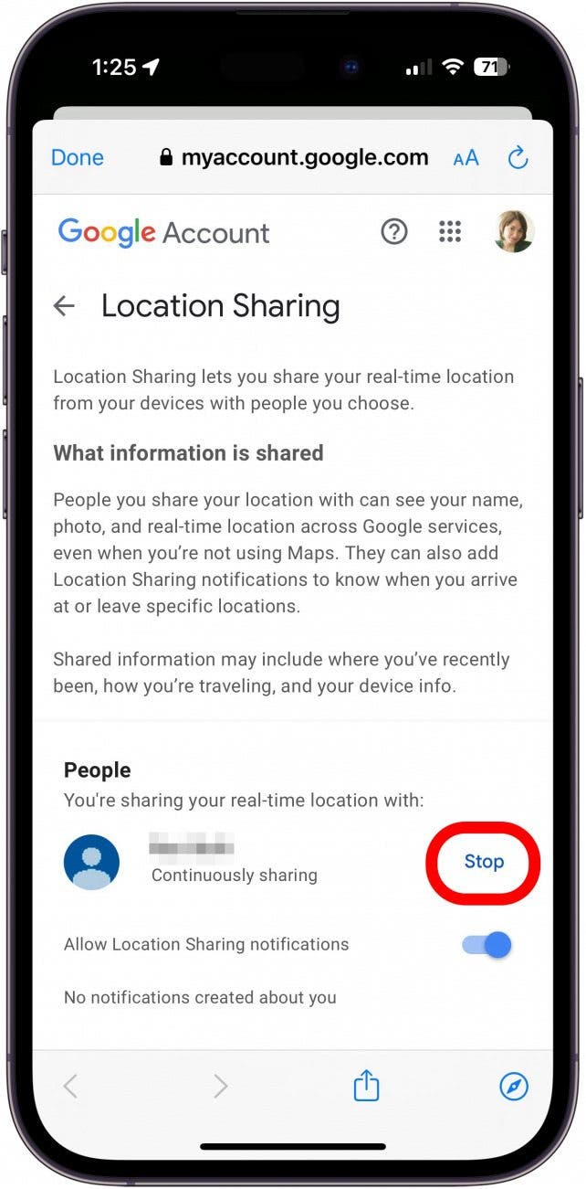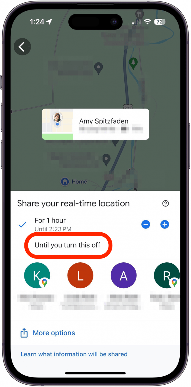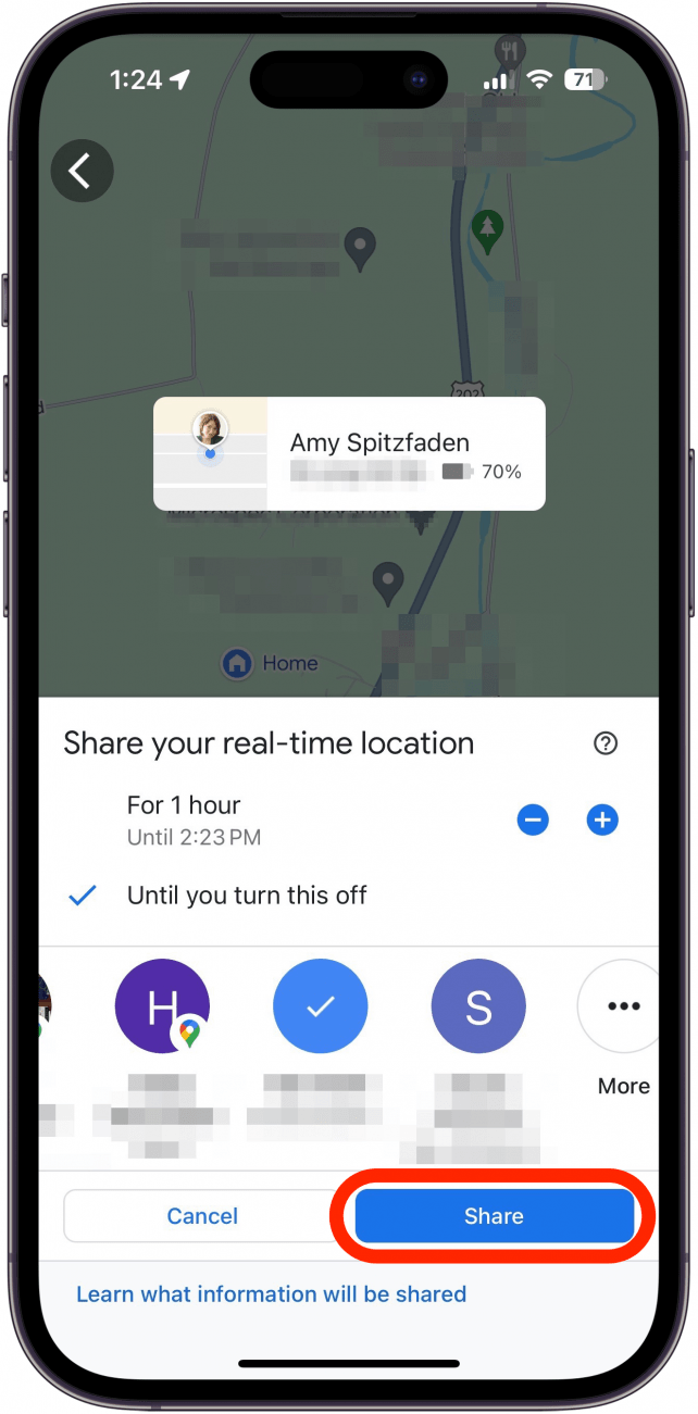 - 在主共享屏幕上,您可以点击正在与之共享的人员,然后点击停止停止与他们分享您的位置。