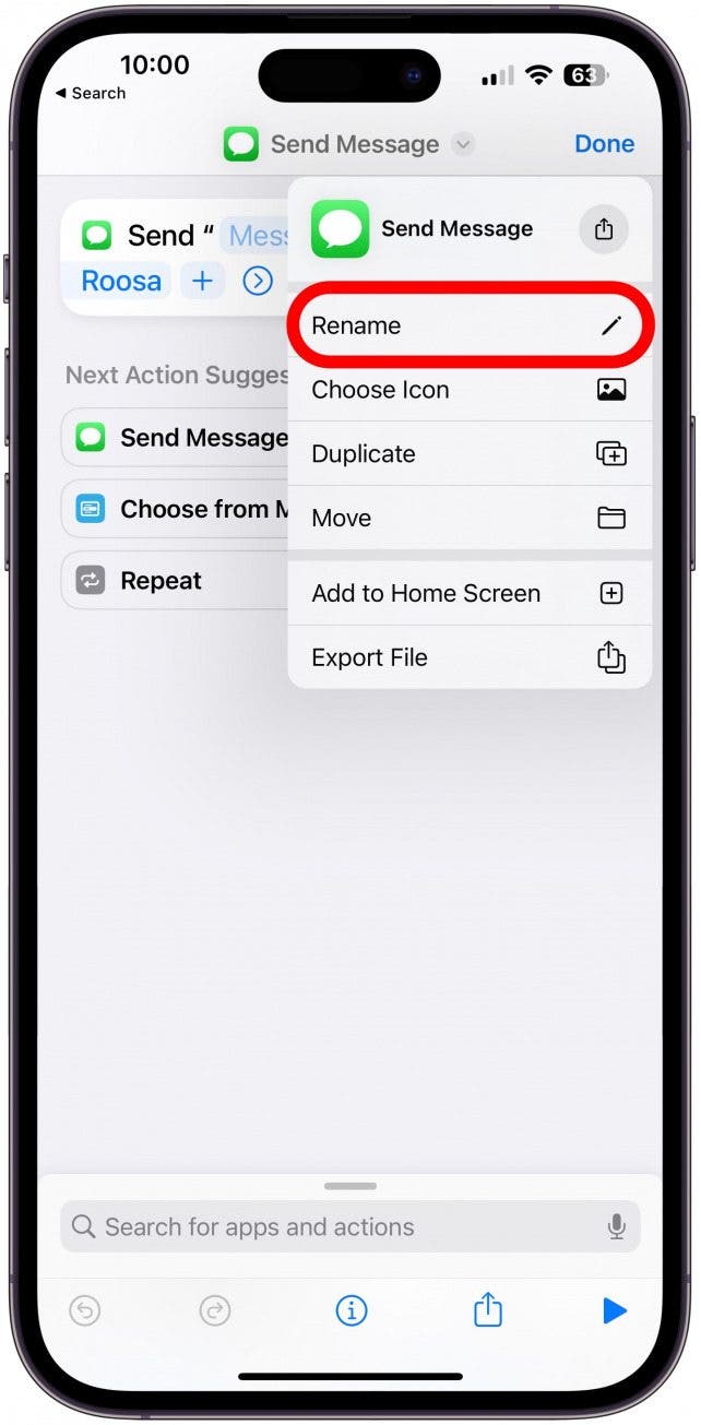 - 轻敲重命名来命名快捷方式。您需要说“嘿 Siri”,然后说出快捷方式的名称才能激活它,因此请考虑一个易于记住的短语。