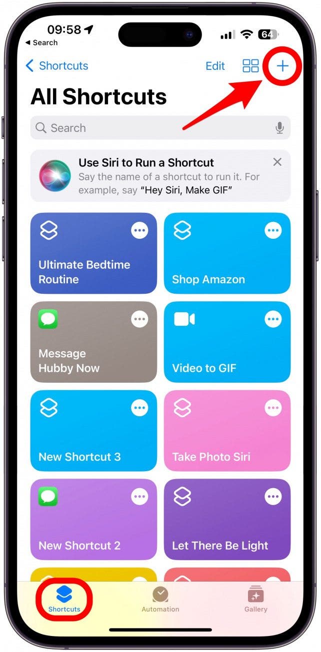 - 导航到“快捷方式”选项卡(如果您尚未到达),然后点击+ 图标在右上角。