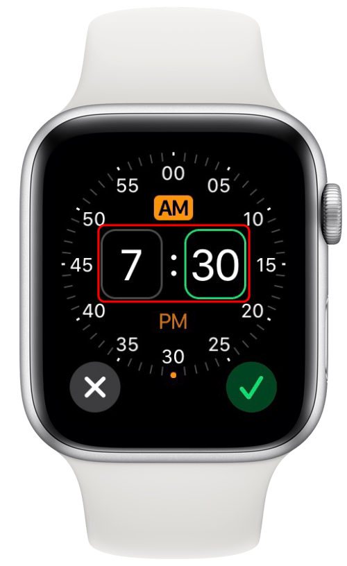 - 从这里,您可以使用数字表冠滚动数字并选择时间。点击每个数字即可更改它。