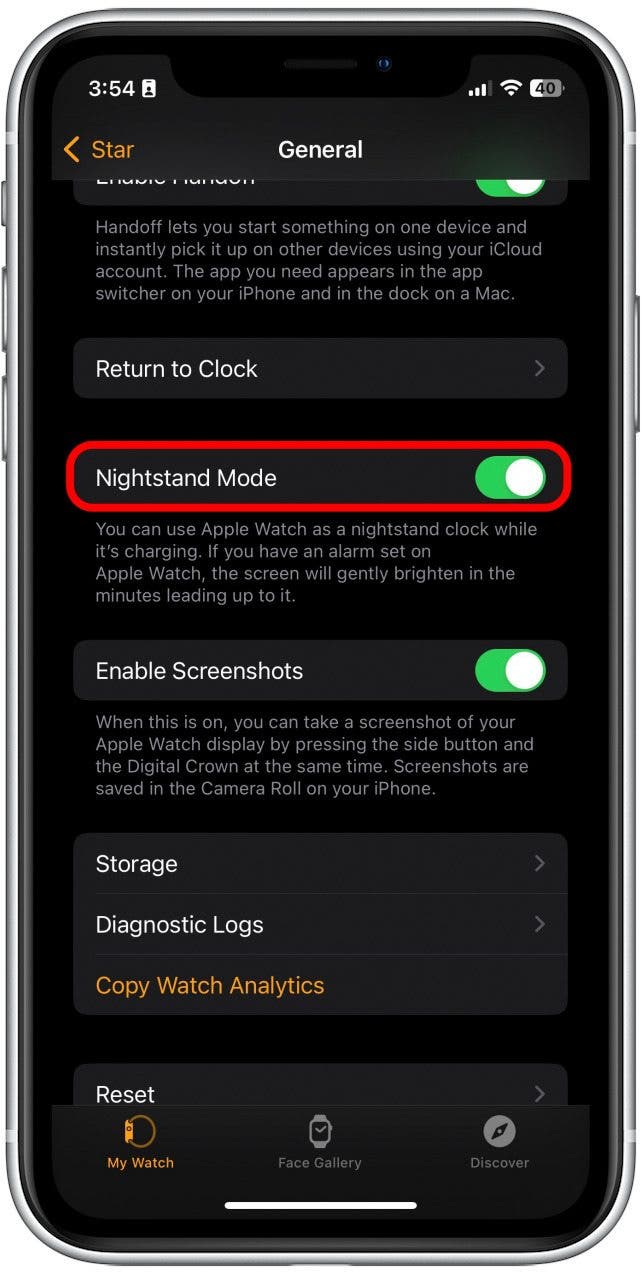 - 要设置床头柜模式,请转至设置 > 常规,然后将床头柜模式切换为打开。启用后它将呈绿色。