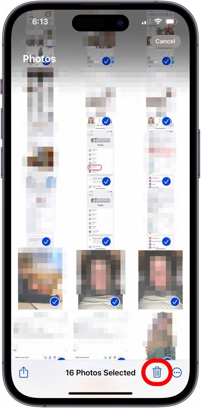 - 点按您要删除的与前任的所有照片。您要删除的所有照片都会有一个蓝色圆圈,上面有一个白色复选标记。点击垃圾桶图标删除照片,然后确认。