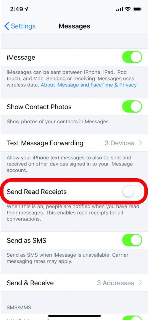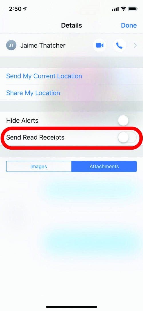 - 个人联系方式:如果您已关闭已读回执,您仍然可以为选定的联系人启用它们(反之亦然)。打开与他们的文本,点击他们的名字,点击信息,然后滑动已读回执。