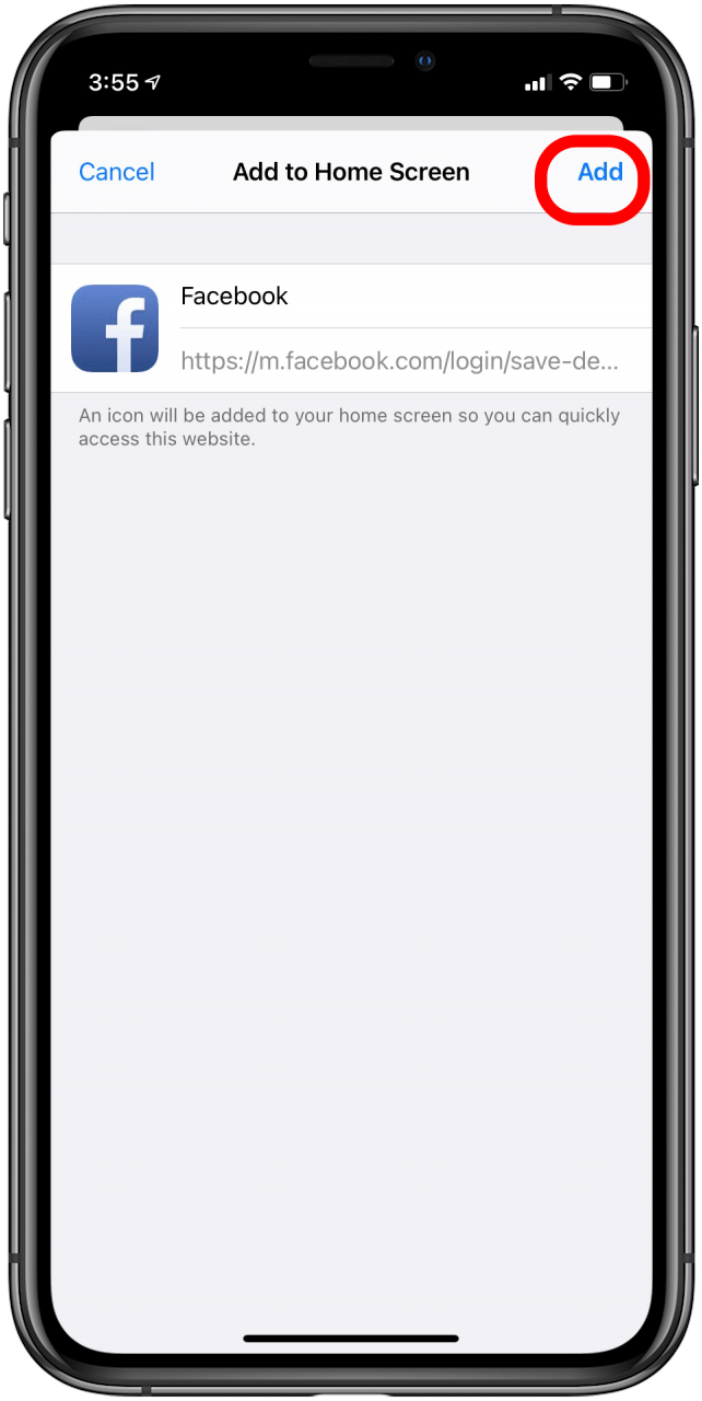 - 将弹出一个屏幕,其中包含您帐户的 URL。当您点击添加,Facebook 图标将添加到您的主屏幕,以便快速访问该网站。