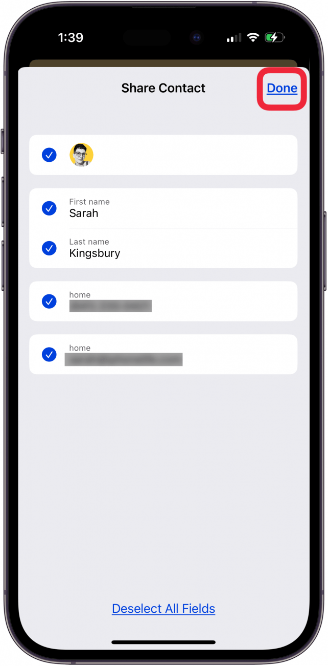- 自定义您想要共享名片的哪些部分;您可以省略电子邮件地址、电话号码、名字和/或姓氏。