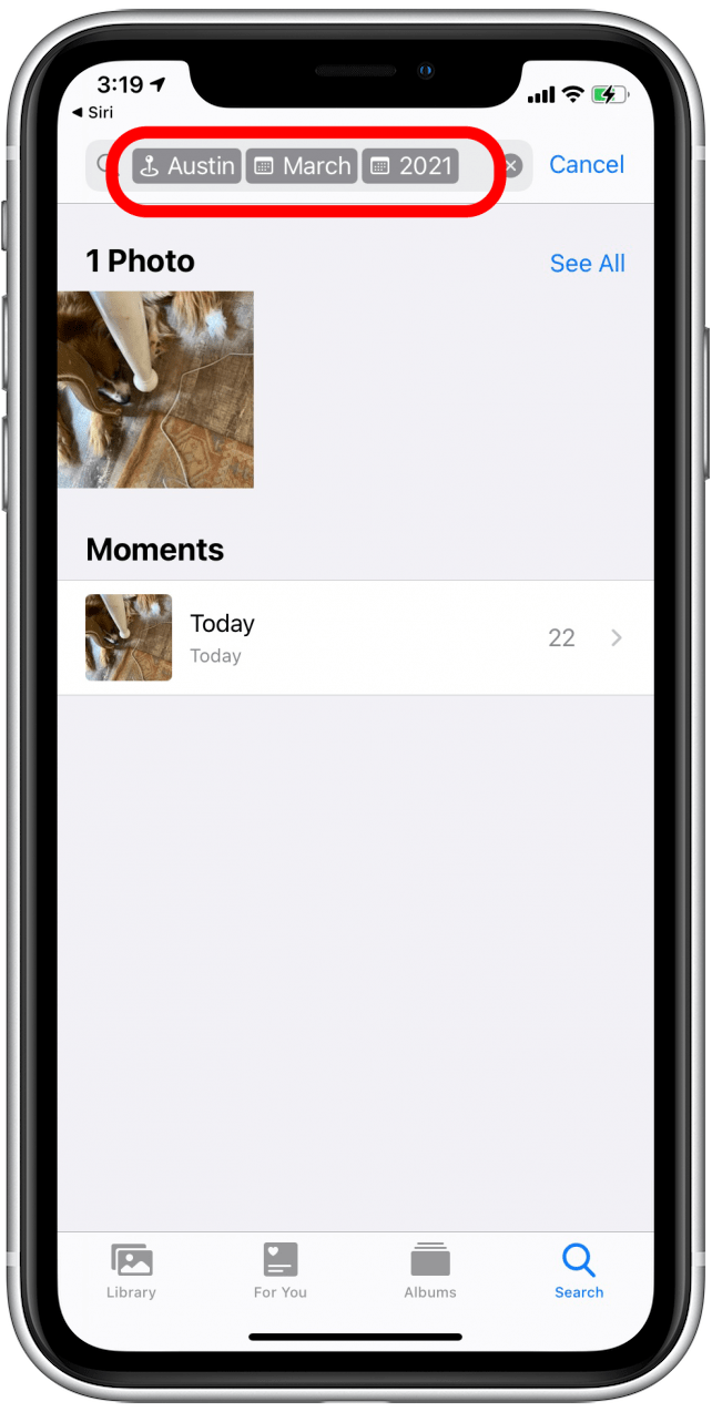 - 将出现带有匹配时间和地点标记的照片。您将能够在搜索栏中看到位置和日期标签。
