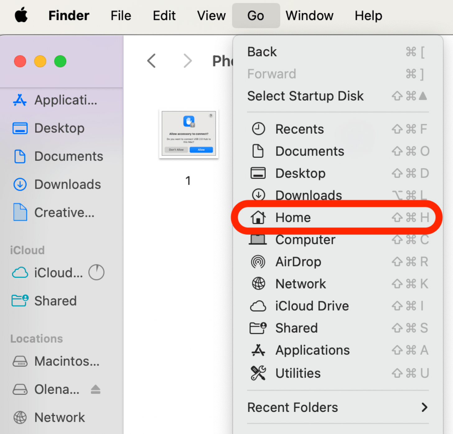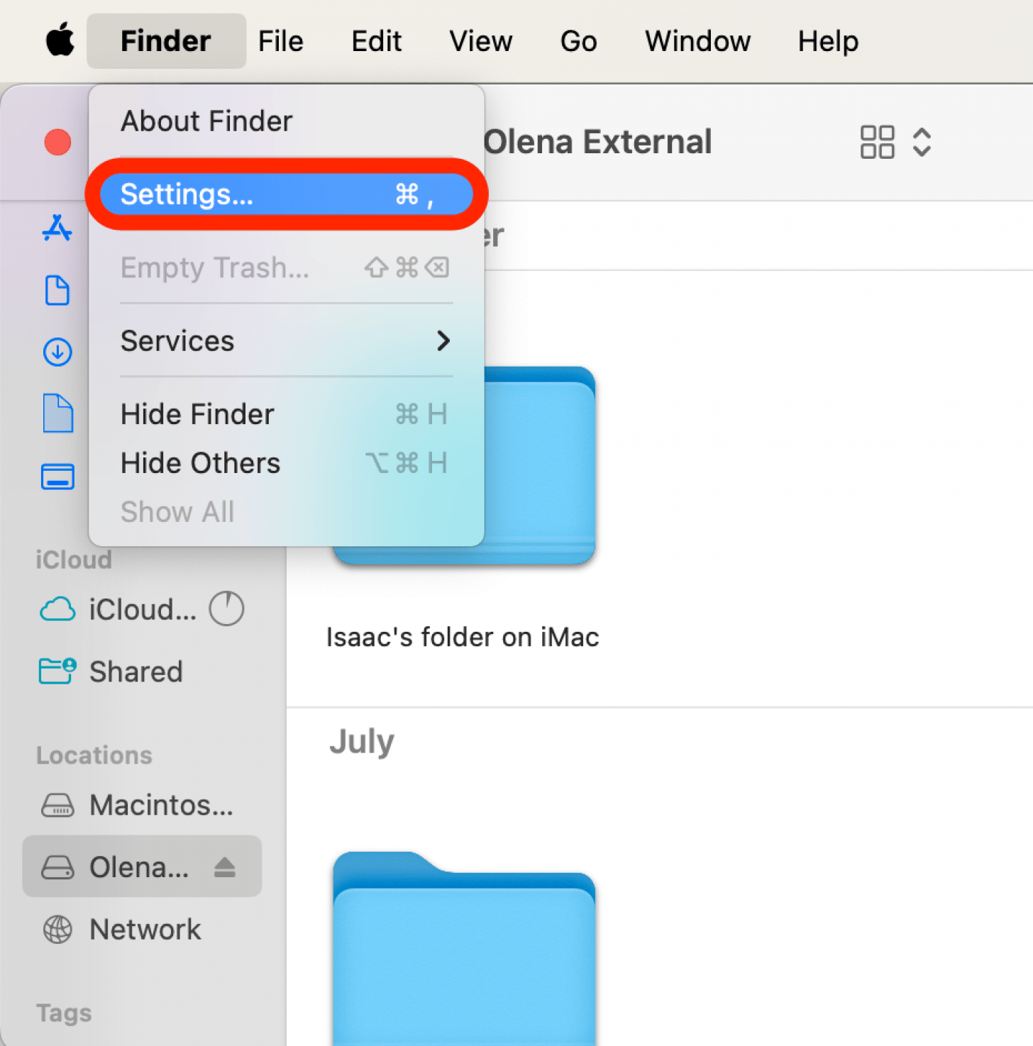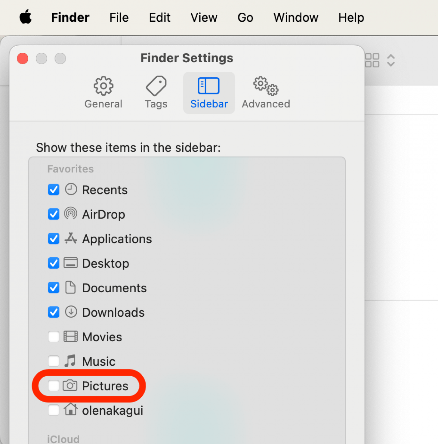 - 如果您没有看到图片文件夹作为一个选项主文件夹, 打开发现者然后点击发现者并单击菜单栏中的设置。