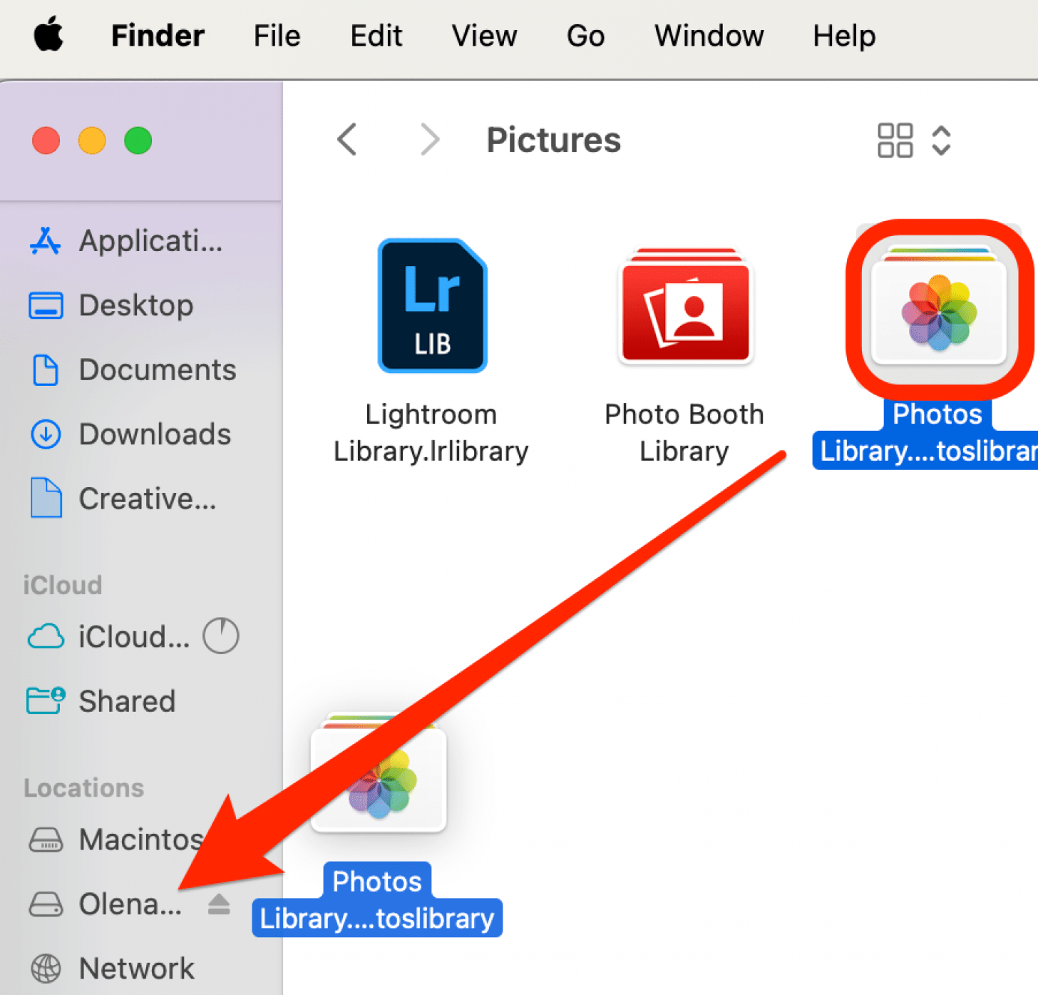 - 要传输 Mac 的照片,请将照片库拖动到硬盘驱动器。
