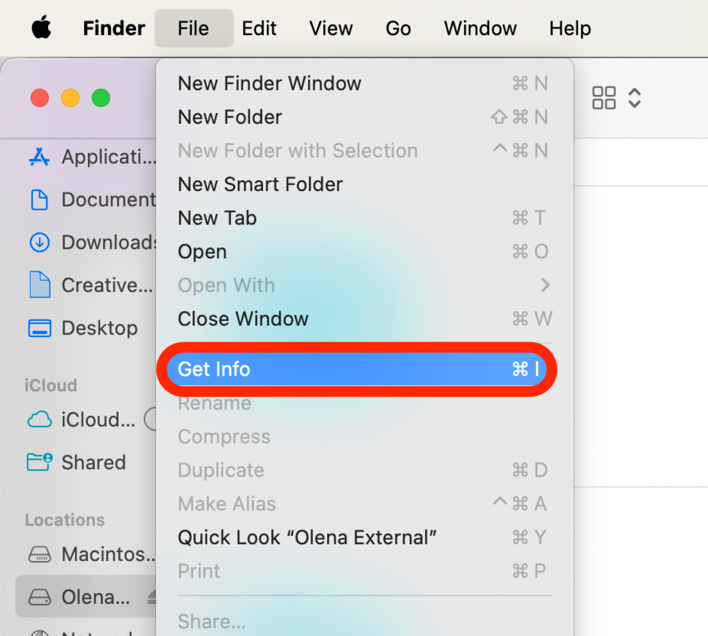 - 打开发现者,单击您的外部存储设备,然后单击文件,然后单击获取信息。