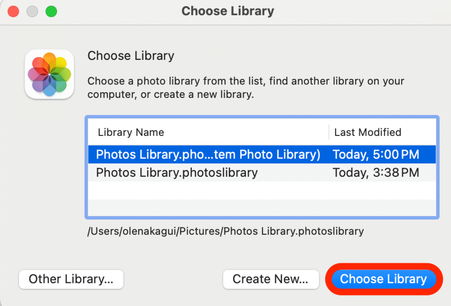 您还可以直接双击外部硬盘驱动器或图片文件夹中的任何一个照片库,以使用“照片”应用程序将其打开。