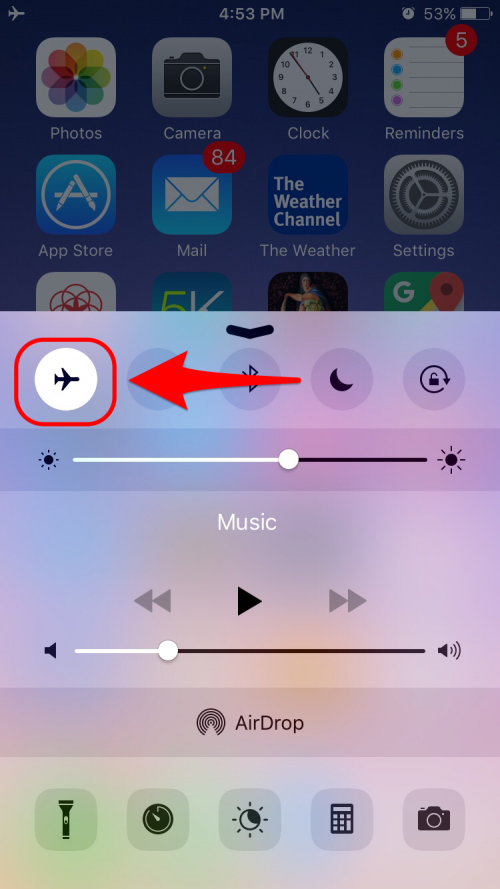 有时,您的 iPhone 无法连接到蜂窝数据服务或 Wi-Fi 路由器。通常,修复方法只需打开飞行模式 30 秒以断开与无线服务的连接,然后将其关闭。这将导致您的 iPhone 忘记之前的连接并建立新的连接。要打开飞行模式,请从主屏幕底部向上滑动控制面板,然后点击飞机图标。您还可以尝试取出 iPhone 的 SIM 卡,然后重新插入。