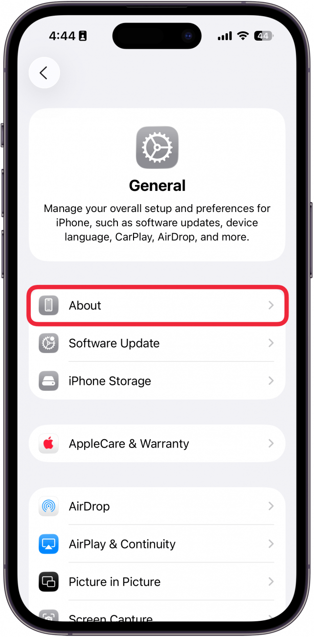 - 打开设置应用程序, 轻敲一般的,然后点击关于,就像你在第一节。如果您看到型号部分,它可能会显示更长的数字,而不是 A#### 格式的数字。