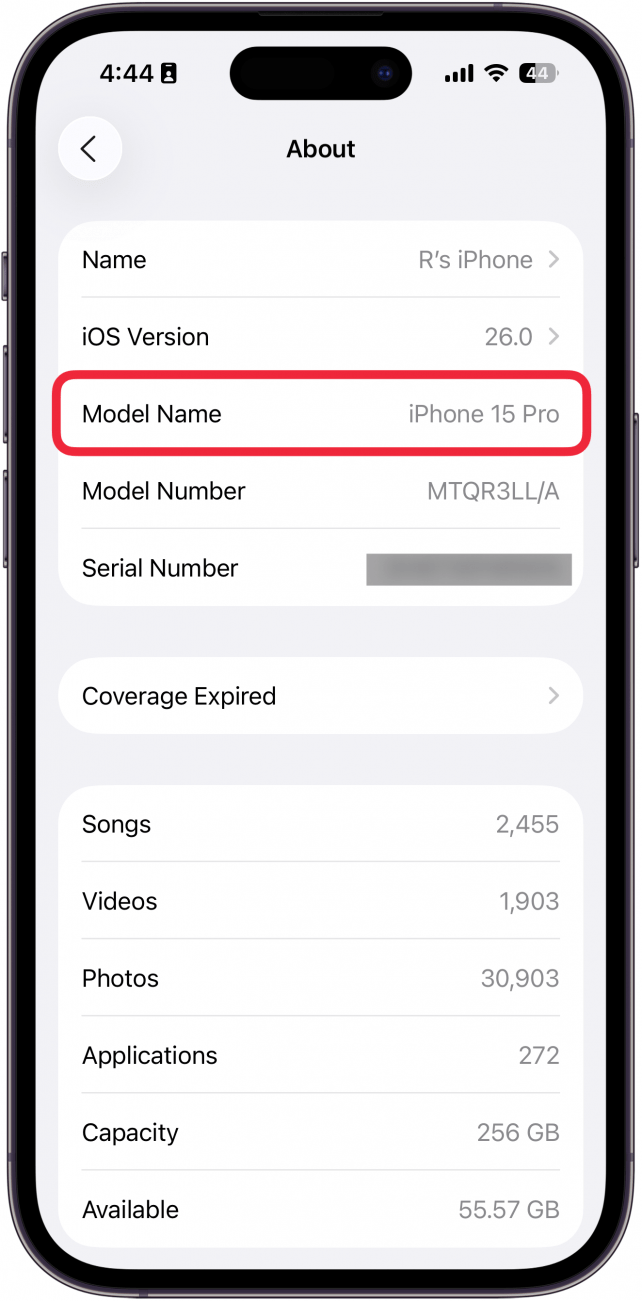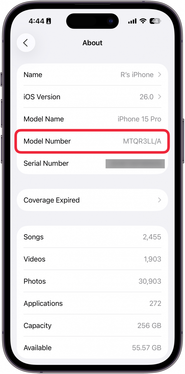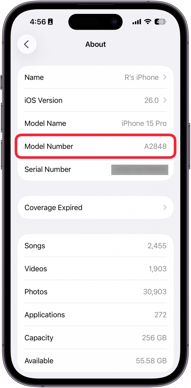 如果您想知道自己拥有哪种 iPhone 并且正在查找 iPhone 的型号,您可能已经尝试过查看 iPhone 的背面。如果背面的数字无法读取,请按照以下步骤操作,看看是否能够找到型号。请注意,您的屏幕可能与我的屏幕截图不符,但它们仍然可以帮助指导您。