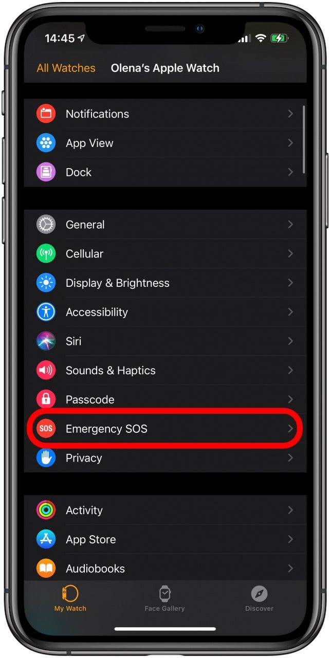 - 切换至转动按住侧面按钮即可拨号离开。您还可以在此处关闭跌倒检测并编辑您的紧急联系人。