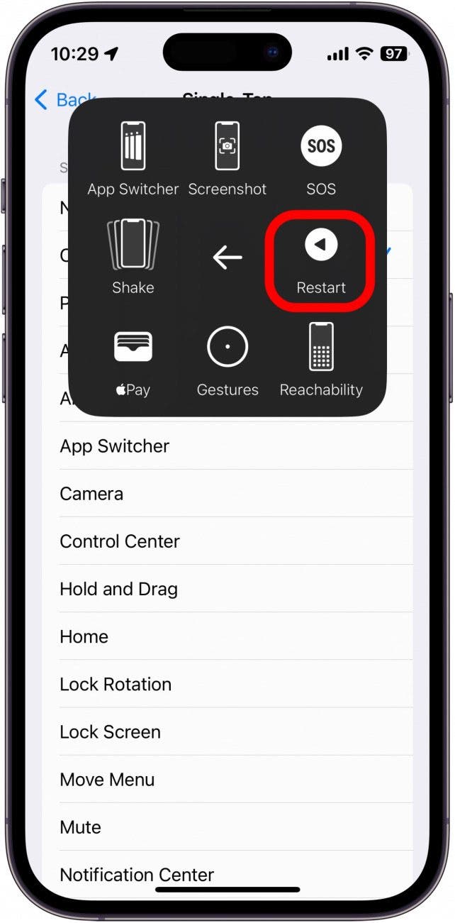 如果您需要重新启动 iPhone,您还可以使用辅助触摸图标: