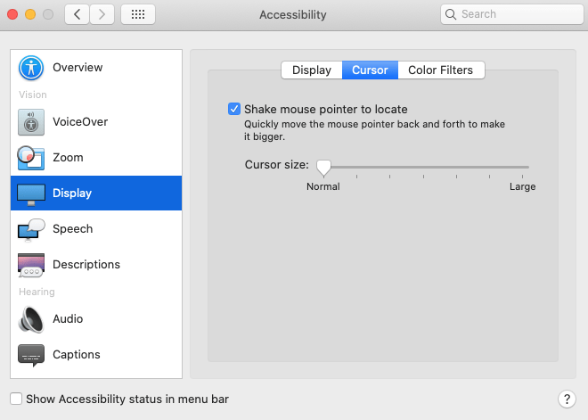 有时,光标并没有消失;有时,光标并没有消失。它只是隐藏起来。要找到 Mac 或 MacBook 鼠标光标,请在触控板上快速左右移动鼠标或手指。此“摇动鼠标指针定位”功能会暂时放大光标,以便于查找。您还可以使其永久更大并且更容易找到。如果未启用“摇动鼠标指针定位”功能,您可以按如下方式打开该功能: