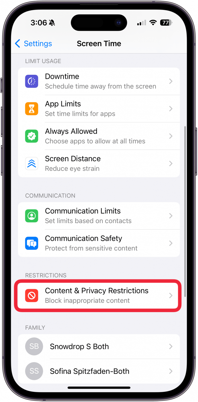 FaceTime 未在您的 iPhone 上显示对方?屏幕时间限制可能是罪魁祸首。检查并确保您的“屏幕时间”设置中没有对 FaceTime 进行任何限制: