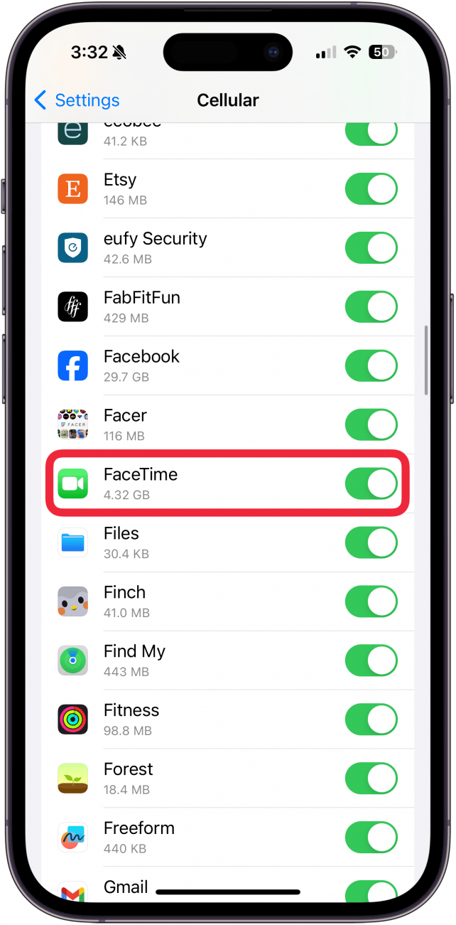 如果您的蜂窝数据或 Wi-Fi 连接出现问题,您可能正在正常通话而不自知。首先,长按手机中的 Wi-Fi 符号,检查以确保您已连接到 Wi-Fi。并查看您连接到的网络。如果您未连接到 Wi-Fi,请检查并确保为蜂窝数据启用 FaceTime: