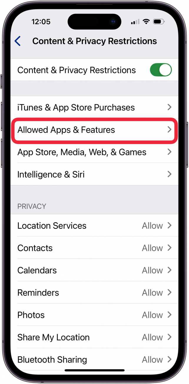 - 打开“设置”应用,点击“屏幕时间限制”、“内容和隐私限制”、“允许的应用程序和功能”,并确保 FaceTime 已打开。