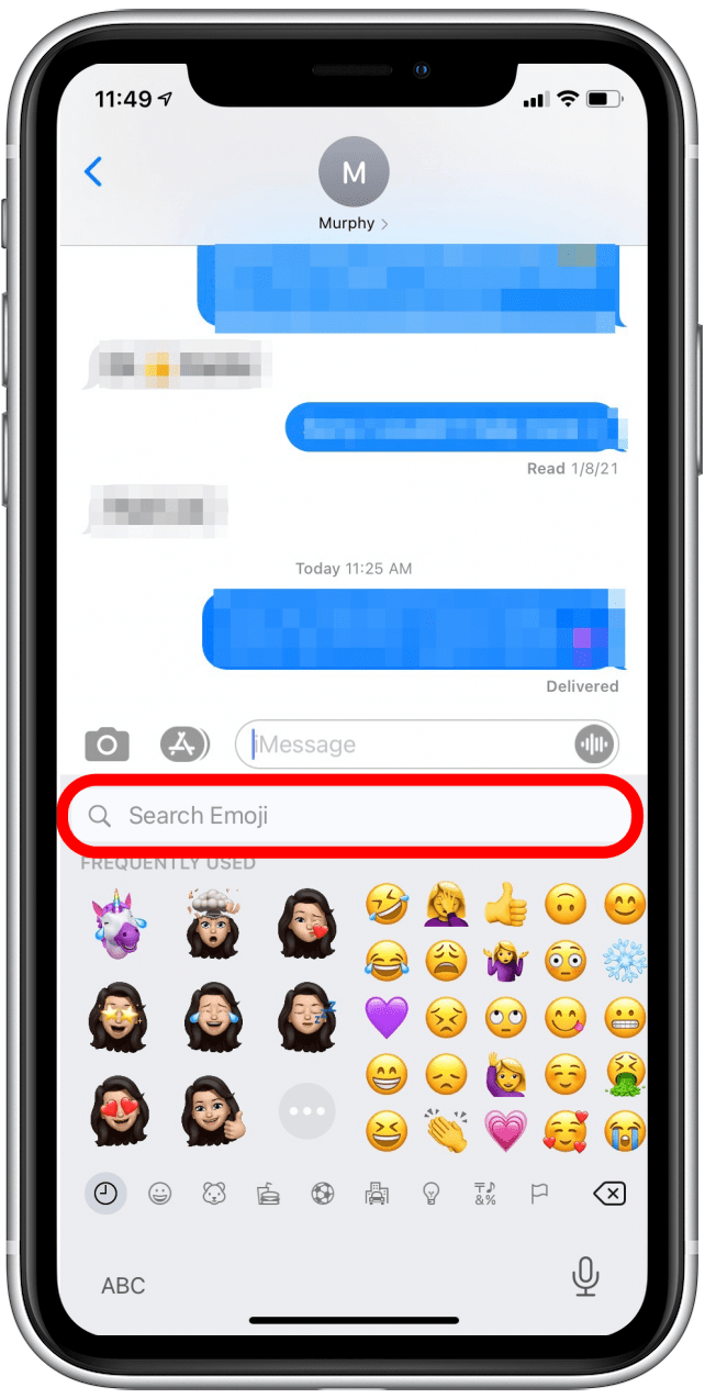 - 要返回文本键盘,请点击搜索表情符号栏上方的文本消息本身。