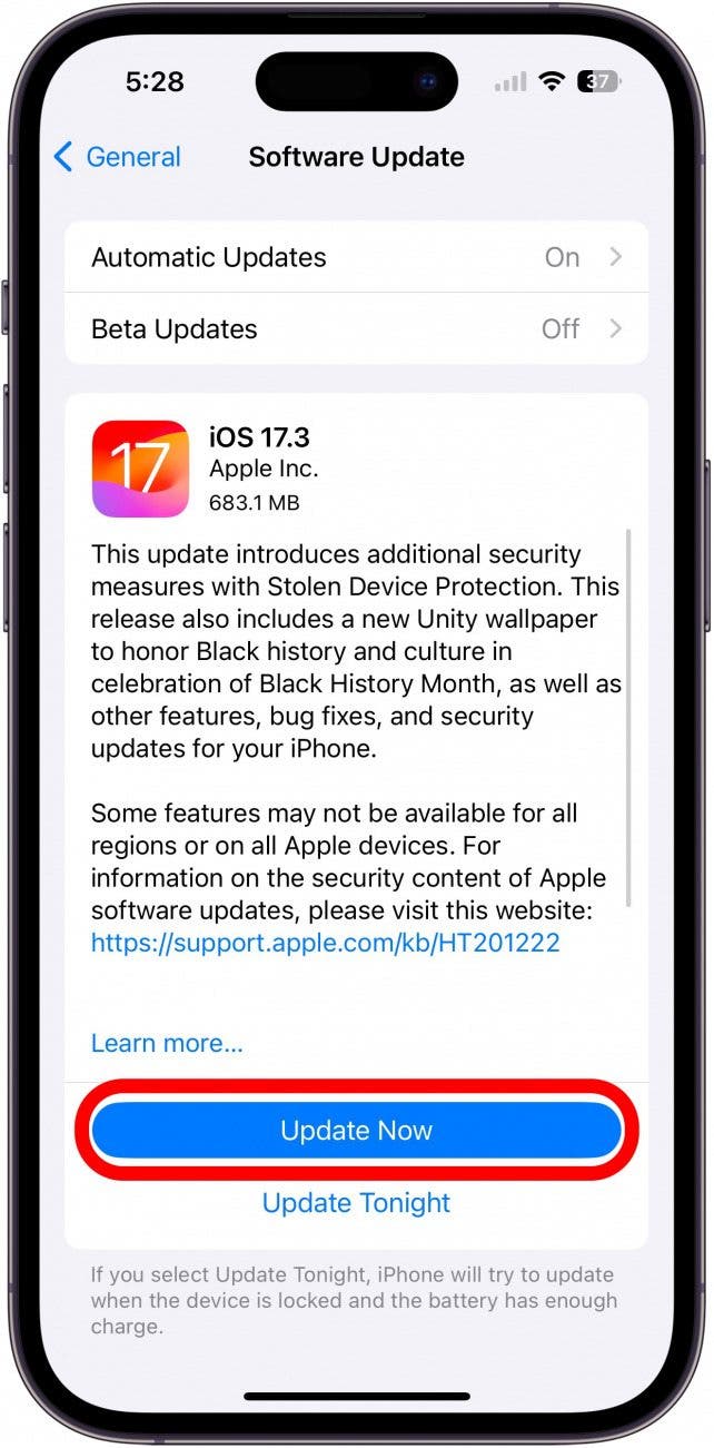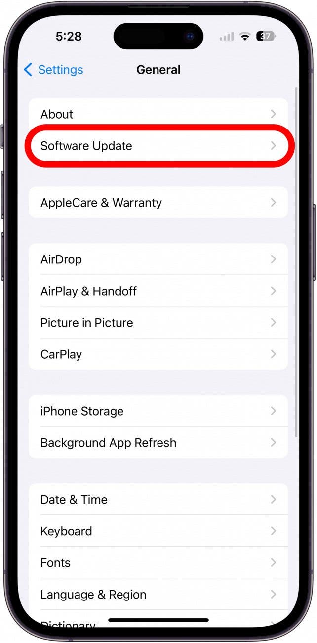 如果您的 iPhone 电池健康状况看起来正常,另一个很好的预防措施是检查可用的软件更新,因为过时的软件可能会导致您的 iPhone 无缘无故地不断打开和关闭。检查可用软件更新的方法如下: